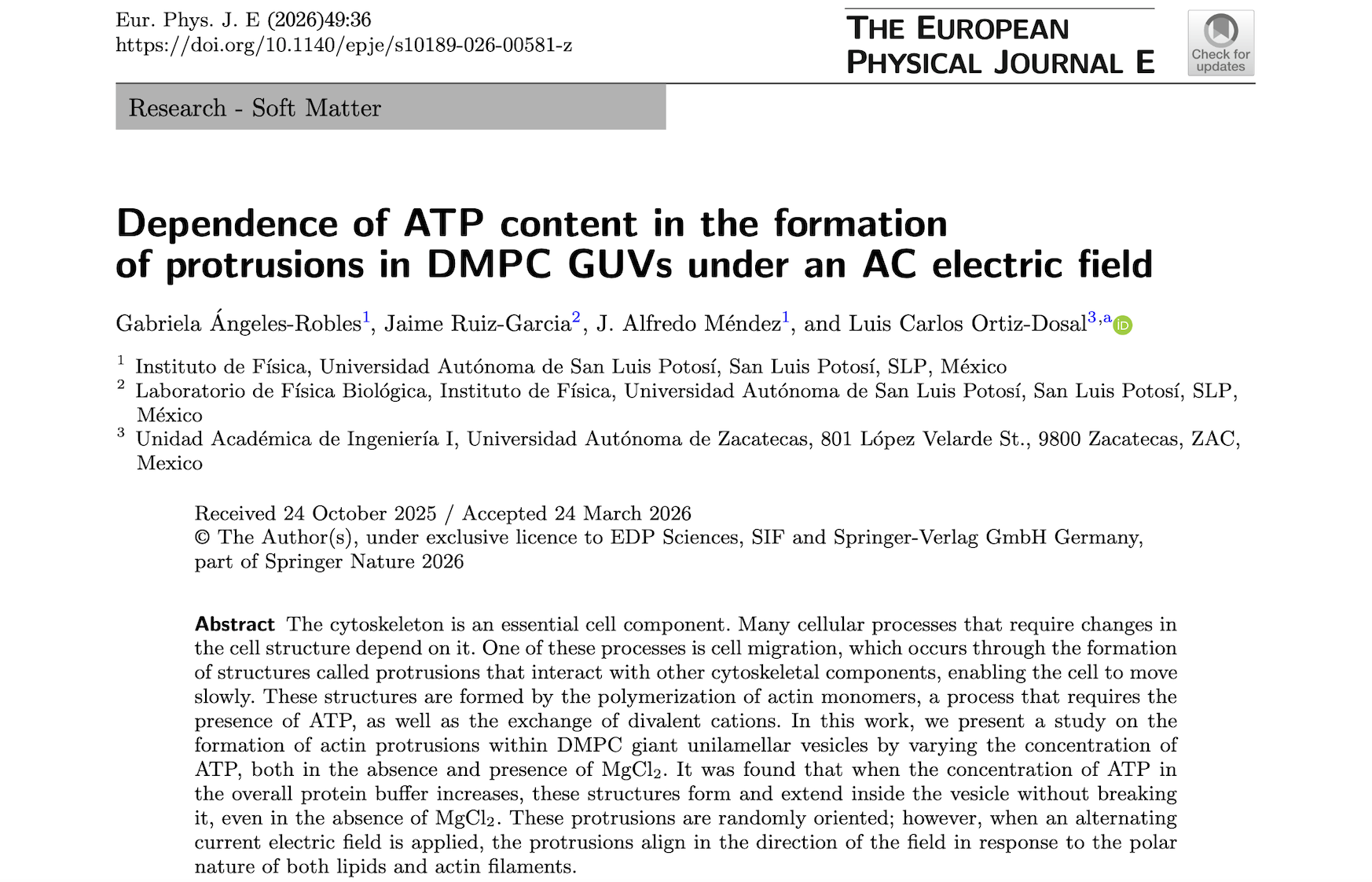 Abstract: The cytoskeleton is an essential cell component. Many cellular processes that require changes in the cell structure depend on it. One of these processes is cell migration, which occurs through the formation of structures called protrusions that interact with other cytoskeletal components, enabling the cell to move slowly. These structures are formed by the polymerization of actin monomers, a process that requires the presence of ATP, as well as the exchange of divalent cations. In this work, we present a study on the formation of actin protrusions within DMPC giant unilamellar vesicles by varying the concentration of ATP, both in the absence and presence of MgCl2. It was found that when the concentration of ATP in the overall protein buffer increases, these structures form and extend inside the vesicle without breaking it, even in the absence of MgCl2. These protrusions are randomly oriented; however, when an alternating current electric field is applied, the protrusions align in the direction of the field in response to the polar nature of both lipids and actin filaments.